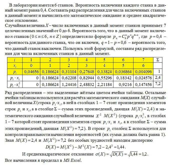 в лабаратории имеется 6 станков.вероятность включения каждого станка в данный момент равна 0,4.составить ряд распределения для числа включенных станков в данный момент и вычислить его математическое ожидание и среднее квадратическое отклонение
