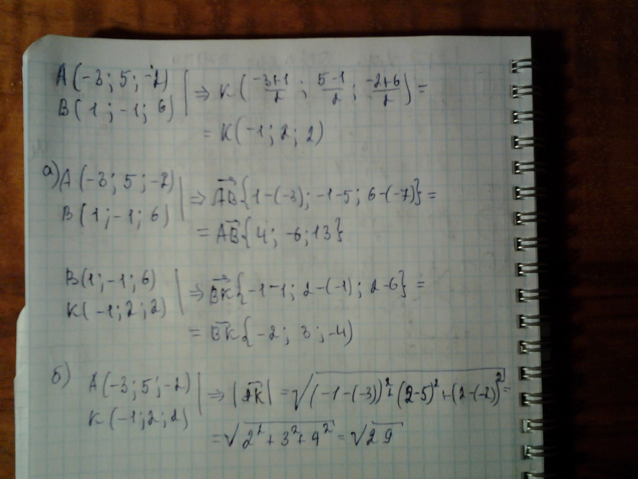 Задано точки А(-3;5;-2), В(1;-1;6), точка К — середина відрізка АВ. Знайдіть: а) координати векторів АВ , ВК ; б) довжину вектора АК