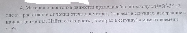 Скорость точки v=dx/dt=3*3*t²-2*2*t=9*t²-4*t м/с. При t=8 c v(8)=9*8²-4*8=576-32=544 м/с.