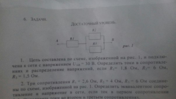 Цепь составленная по схеме, изображённой на рис 1. R1=2 Om, R2=4 Om, напряжение в сети 12 В, а общий ток равен 2,4 А.Определить величину сопротивлений R3, ток в нем и распределить напряжение в цепи.