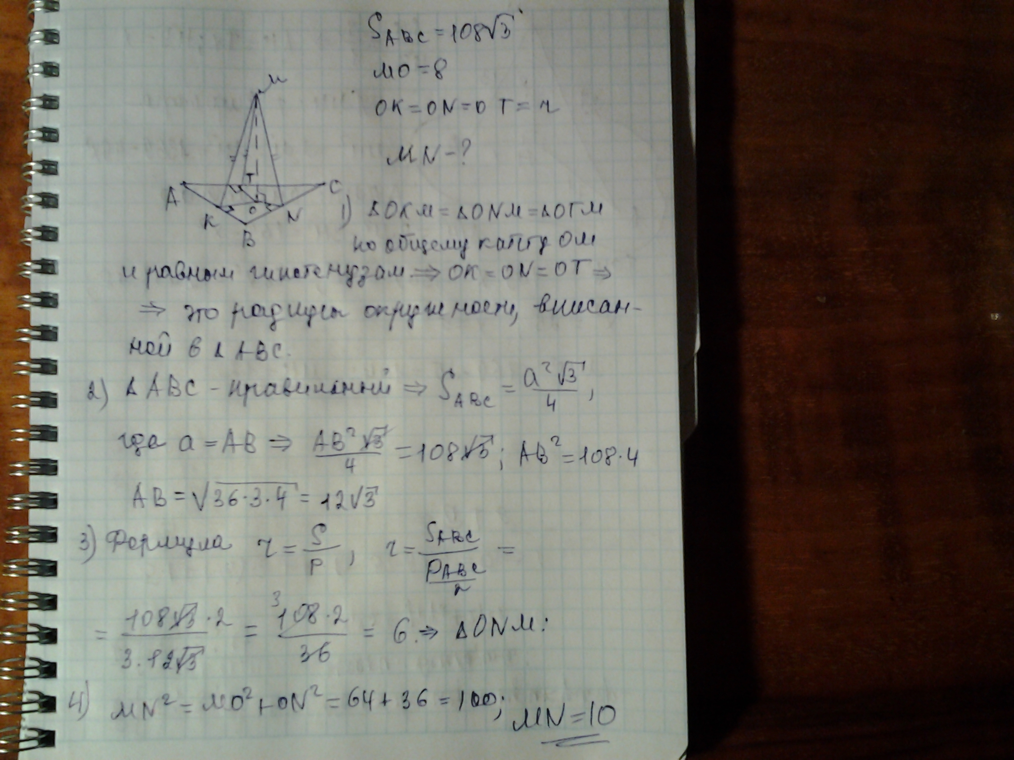 см2. Точка М віддалена від площини трикутника на 8 см и рівновиддалена вид його сторін. Знайти відстань вид точки М до сторін трикутника.