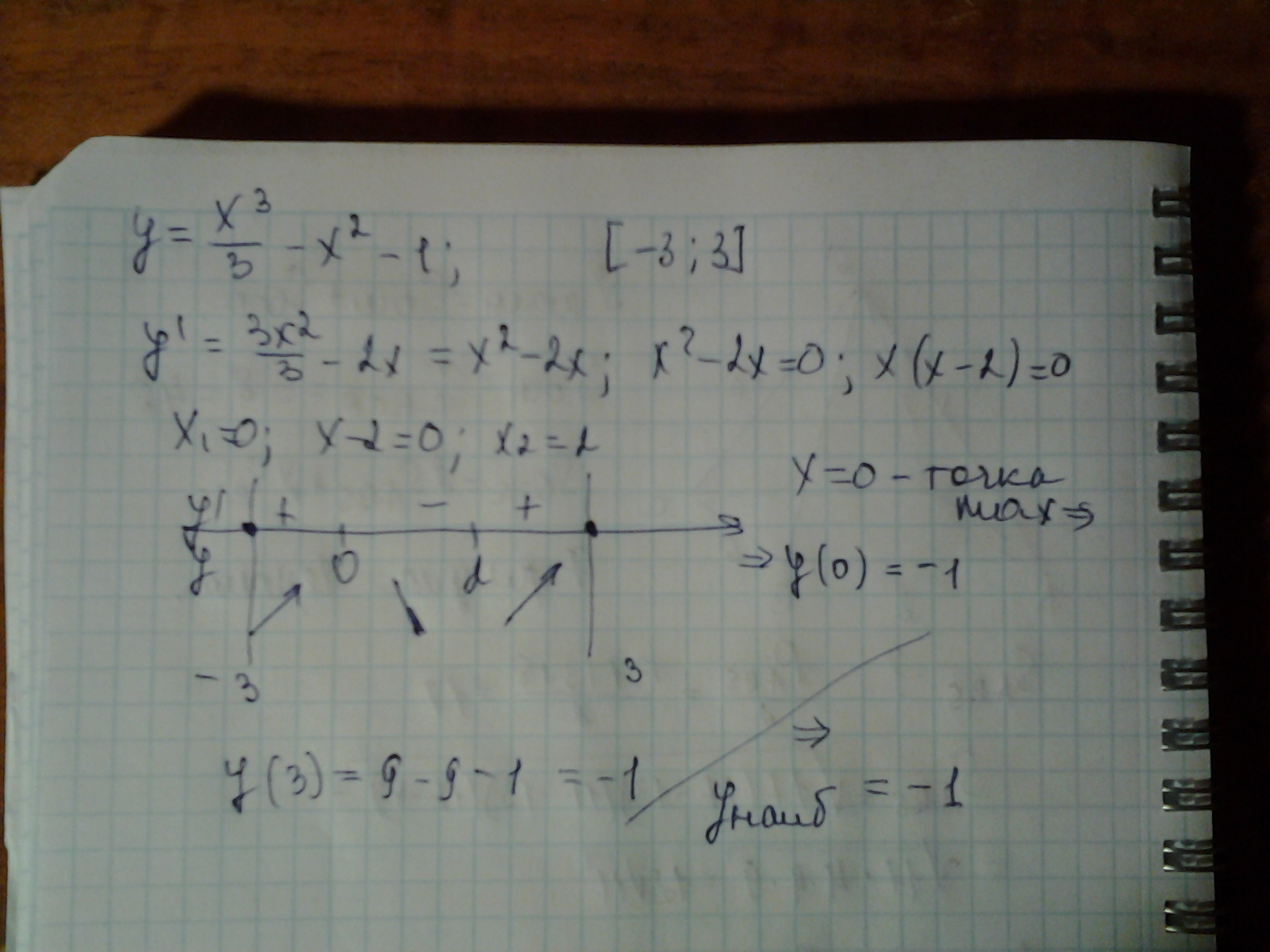 y(3)= 3³/3 - 3² -1= 9-9-1= -1 - наибольшее