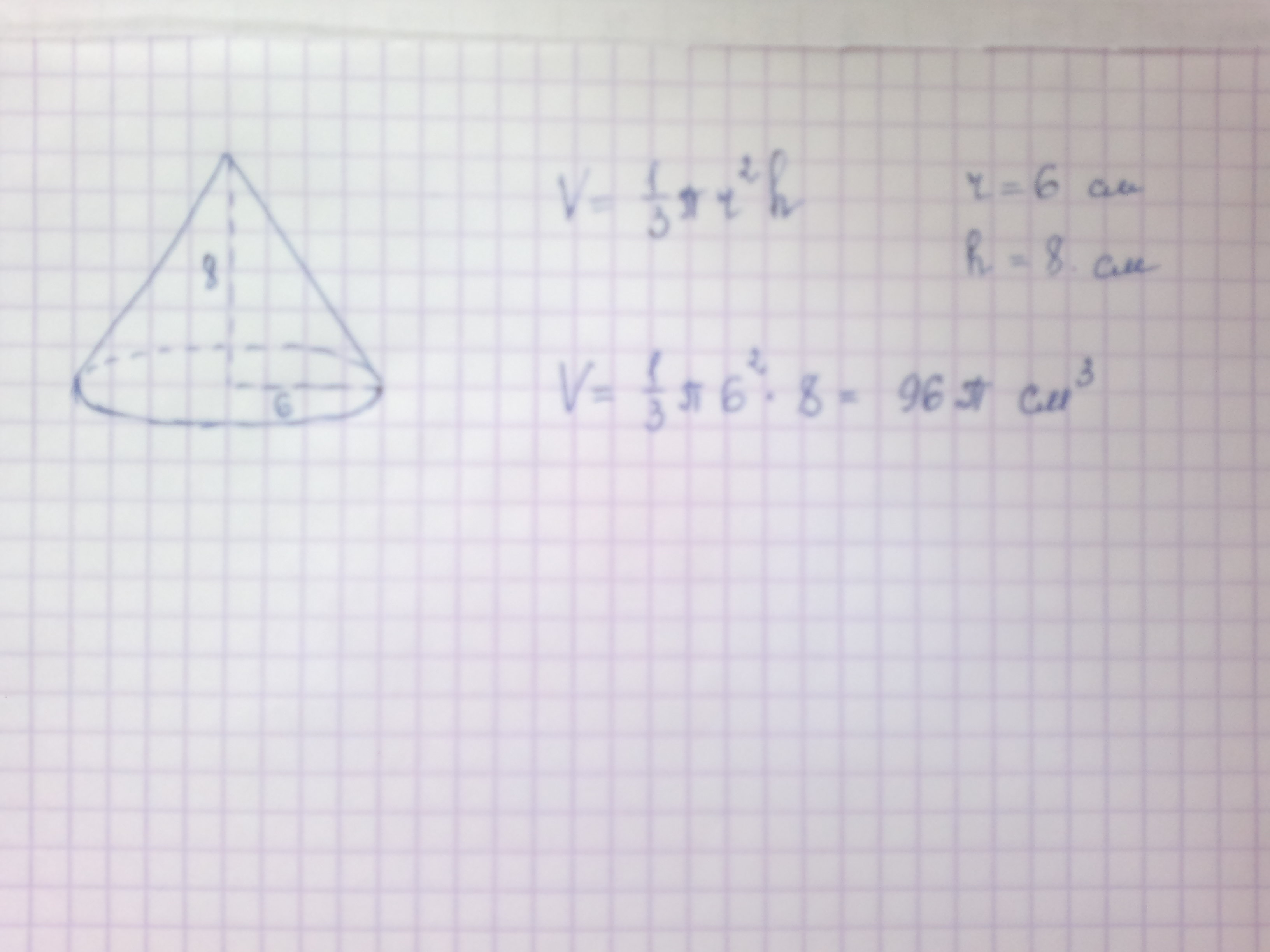 Прямоугольный треугольник с катетами 8 см и 6 см вращается вокруг большого катетами .Найти объем полученного тела вращения