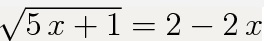 sqrt{5x+1}=2-2x, \ left { {{5x+1 geq 0,} atop {2-2x geq 0;}} right. left { {{xgeq-0,2,} atop {xleq1;}} right. -0,2 leq x leq 1;\ 5x+1=4-8x+4x^2, \ 4x^2-13x+3=0, \ D=169-48=121, \ x_{1,2}=frac{13pm11}{8}, \ x_1=0,25, x_2=3 textgreater  1, \ x=0,25.