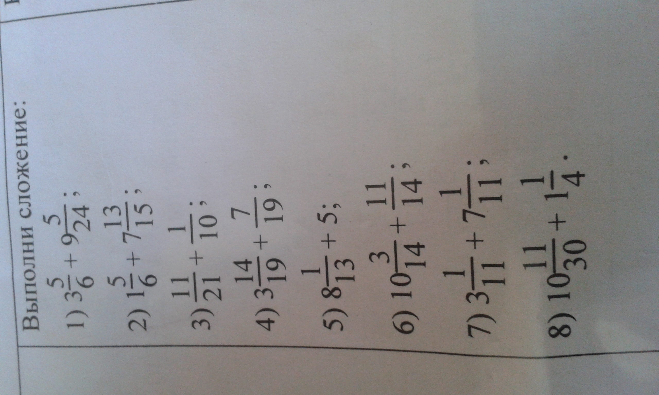 frac{11}{21} + frac{1}{10} = frac{11*10}{21*10} + frac{1*21}{10*21} =frac{110}{210} + frac{21}{210} = frac{131}{210}  \  \  \ 3 frac{14}{19}  + frac{7}{19}= 3 frac{14+7}{19}=3 frac{21}{19} =4 frac{2}{19}  \  \  \  8frac{1}{13} +5=13frac{1}{13} \  \  \
