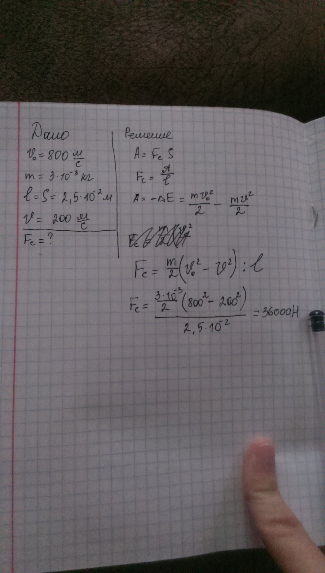 пуля имела скорость 800 мс и массу 3г и врезалась в доску длиной 2.5 см и после приобрела скорость 200 м.с. найти силу сопротивления доски