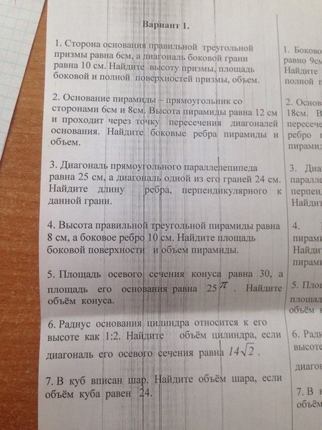7) Пусть а - ребро куба, тогда а³=24. Но а=2*R, где R - радиус шара. Объём шара V=4/3*π*R³=4/3*π*(a/2)³=4/3*π*a³/8=4/3*π*24/8=4*π. Ответ: V=4*π.