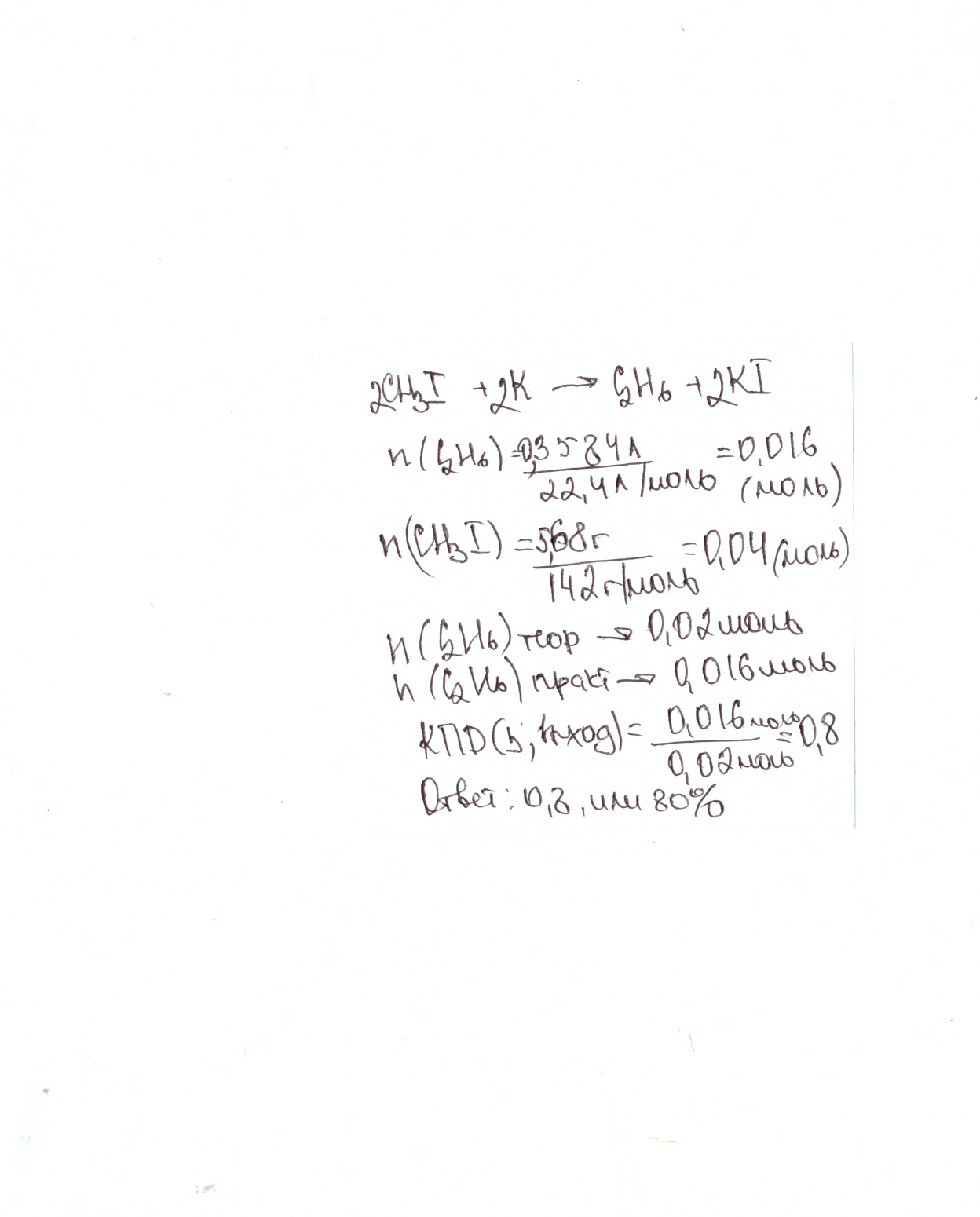 при нагревании 5,68г йодметана с калием получили этан 358,4мл этана. определить выход продукта реакции