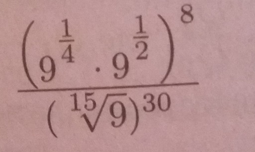 1. В числители показатели степени приводим к общему знаменателю, получаем 9 в степени 1/4 умножить на 9 в степени 2/4. При возведении степеней с одинаковым основанием (9) показатели степени складываются, получаем 9 в степени 3/4. Затем возводим числитель в 8 степень, показатели перемножаются. В числители получаем 9 в 6 степени. В знаменателе представляем корень 15 степени из 9 как 9 в степени 1/15, возводим все в 30 степень перемножая показатели, получаем 9 в 2 степени. В итоге получаем дробь 9 в 6 разделить на 9в 2, показатели степени вычитаются, получаем 9в 4 или 6561