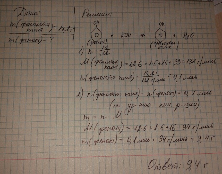 всего Молярная масса 94 гр. М масса калия фенолята 93(минус атом водорода замещенный калики) + масса калия будет 93+39=132. Тут и так видно что в 10 раз больше и можно сразу сказать 9,4. Но мы ж химики, надо до конца: 94 грам кислоты соответствует 132 грамма фенолята Х грамм кислоты 13,2 грамма фенолята таким образом Х=94*13,2/132=9,4