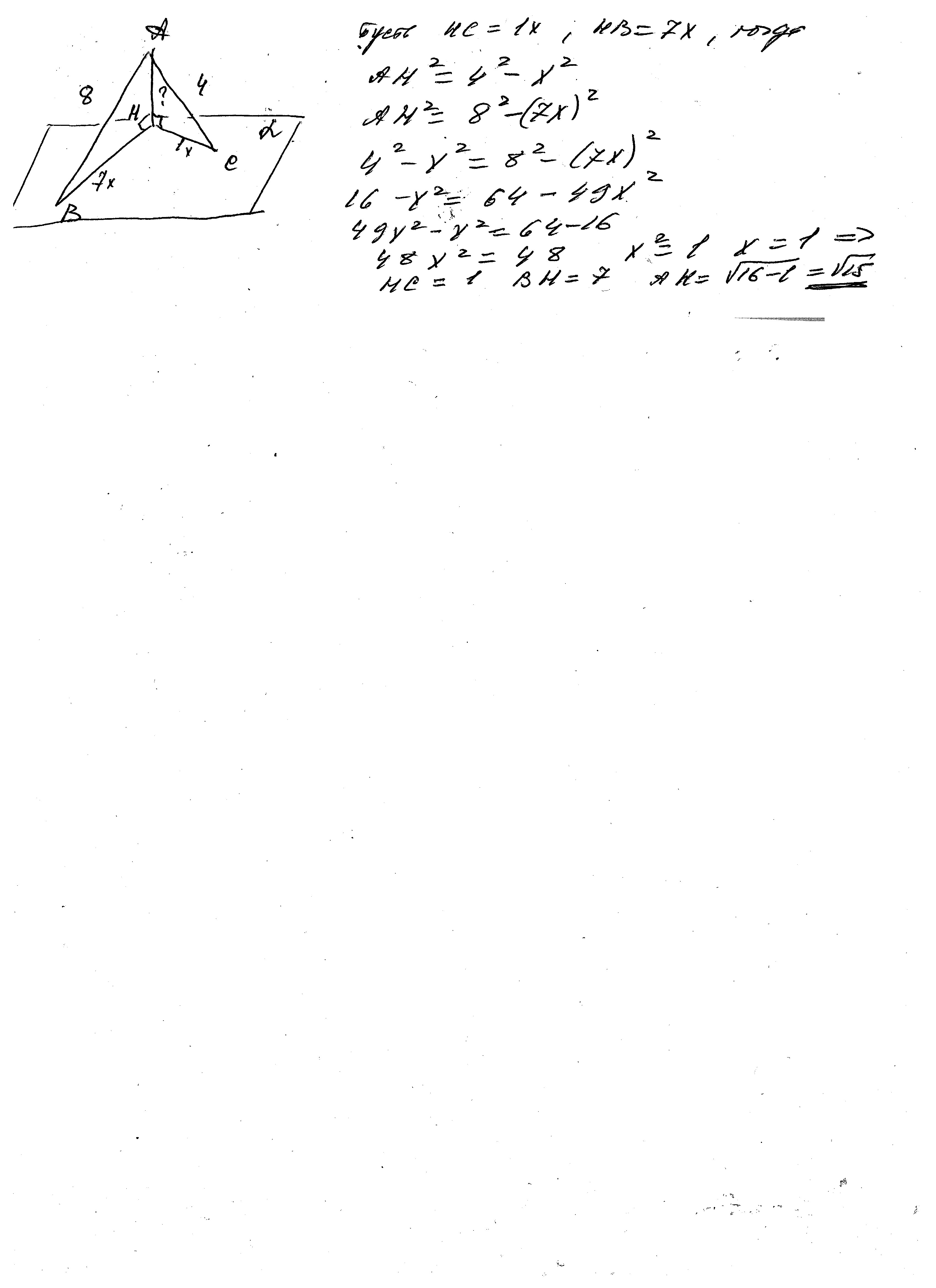 Из точки к плоскости проводим 2 наклонные, длины которых 4 и 8 см. вычислить расстояние от точки до плоскости. если длины их проекций относятся как 1:7.