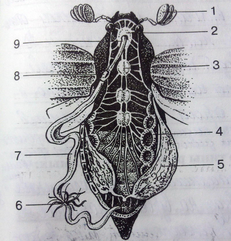 1. Усик 2. Окологлоточное нервное кольцо. 3. Грудной нервный узел4. Трахеи. 5. Яичник. 6. не знаю. 7. тоже не знаю .8. Желудок 9. Пищевод.