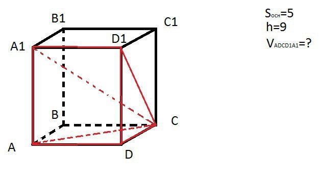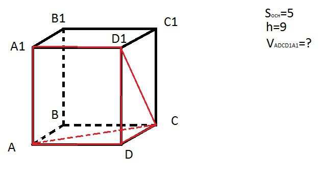 Дана правильная прямоугольная призма ABCDA1B1C1D1. Площадь ее основания - 5, Высота - 9. Чему равен объем фигуры, ограниченный точками ADCD1A1?