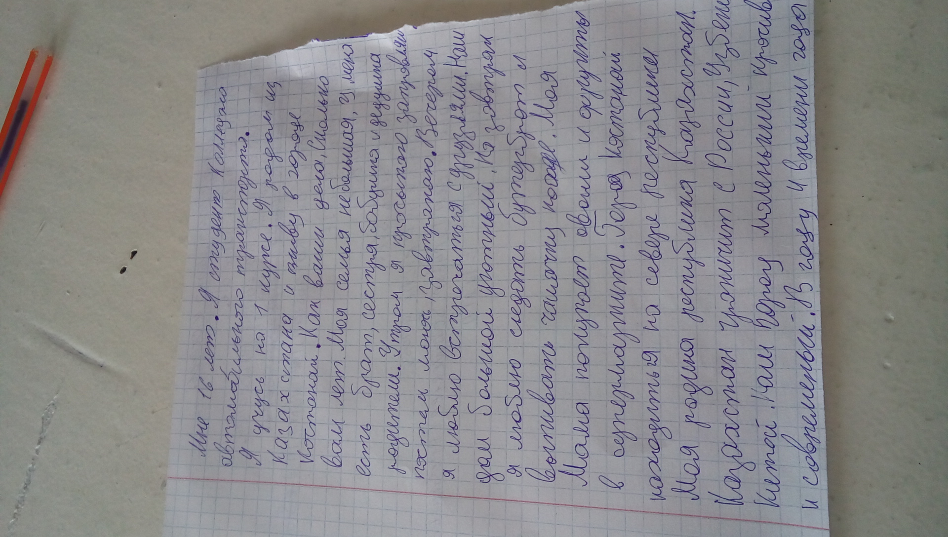 Ich bin 16 Jahre alt. Ich bin Student des Colleges für Strassenverkehr/ Autotransport. (здесь я не знаю точно, как. у вас наверняка учитель говорила, как будет колледж автотранспорта-если знаешь- замени.) Ich studiere im ersten Studienjahr. Ich komme aus Kasachstan und lebe in der Stadt Kostanai. Wie geht es Ihnen? Wie alt sind Sie? Meine Familie ist nicht gross. Ich habe Grosseltern, Eltern und zwei Geschwister. Morgens stehe ich auf, mache das Bett, wasche mich und frühstücke. Abends treffe ich mit Freunden gern. Unser Haus ist gross und gemütlich. Zum Frühstück mache ich mir ein belegtes Brot und trinke eine Tasse Kaffee. Meine Mutter kauft Obst und Gemüse im Supermarket. Die Stadt Kostanai befindet sich im Norden der Republik. Meine Heimat ist die Republik Kasachstan. Kasachstan grenzt an Russland, Usbekistan und China. Unsere Stadt ist klein, aber schön und modern. Ein Jahr hat vier Jahreszeiten.