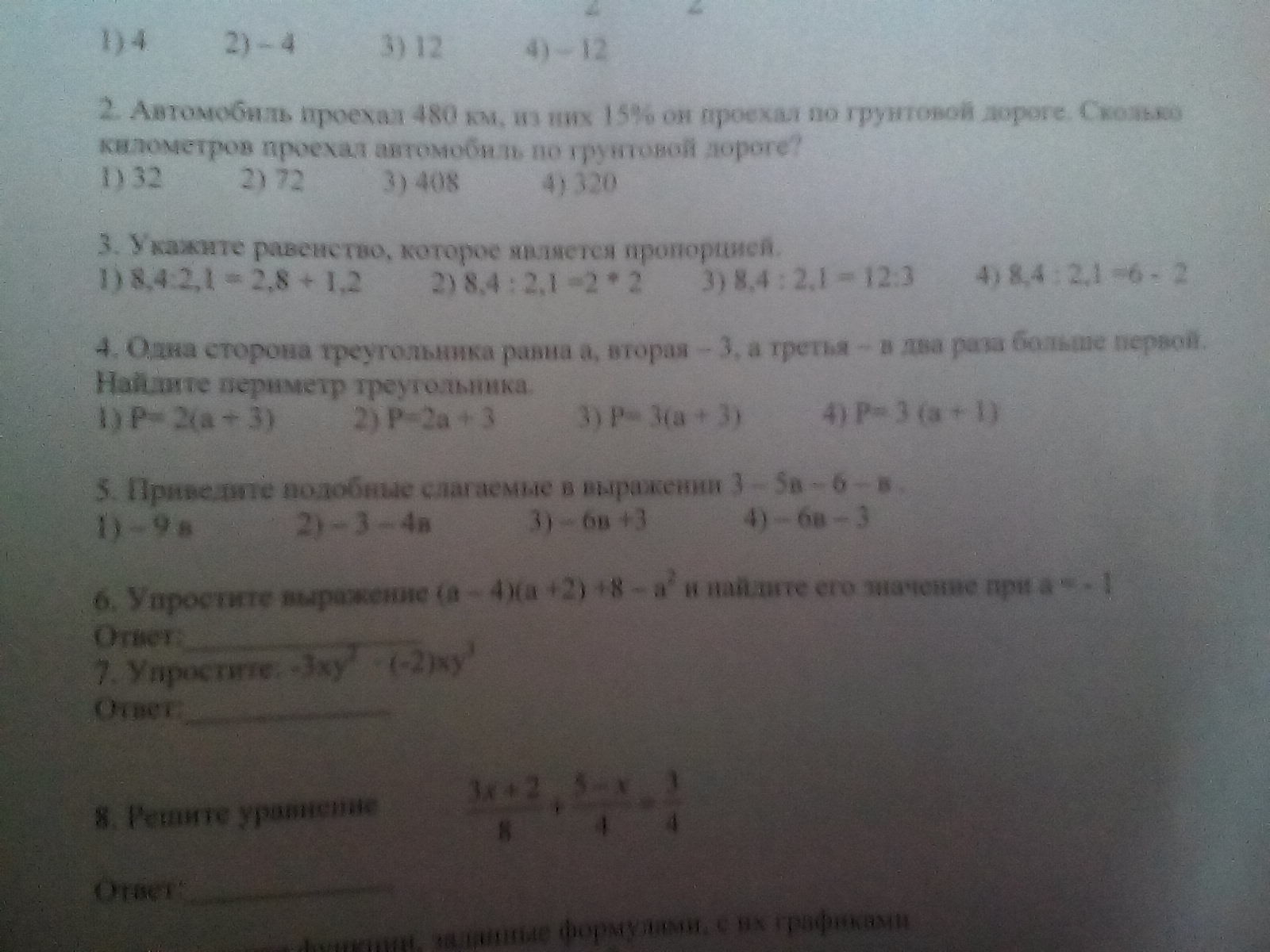 2)ответ 2 т.к.48-10% 24-5% 48+24=72 3)ответ:3 т к пропорция это а:в=с:б 4)ответ 4 т.к. -3+(-6)=-3 и -5б-б=-6б соответствует