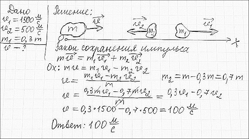 v=(m1v1-m2v2)/m=(0,3mv1-0,7mv2)/m= 0,3v1-0,7v2=0,3*1500-0,7*500= 450-350=100 м/с.
