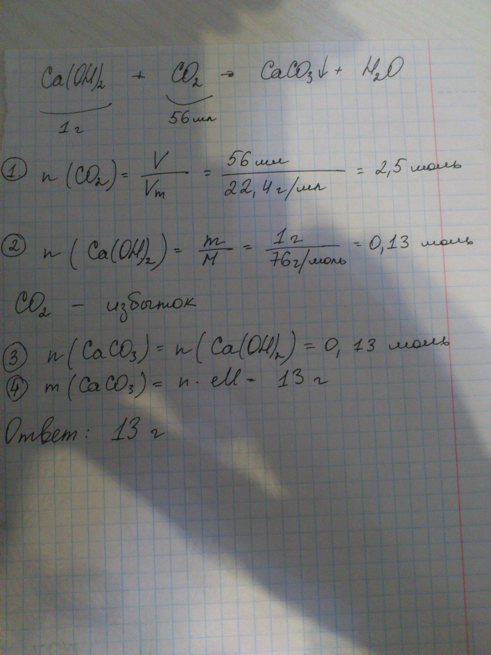 определите массу осадка образующегося при пропускании 56мл углекислого газа (н.у) через раствор , содержащий 1г гидроксида кальция. Спасибо))