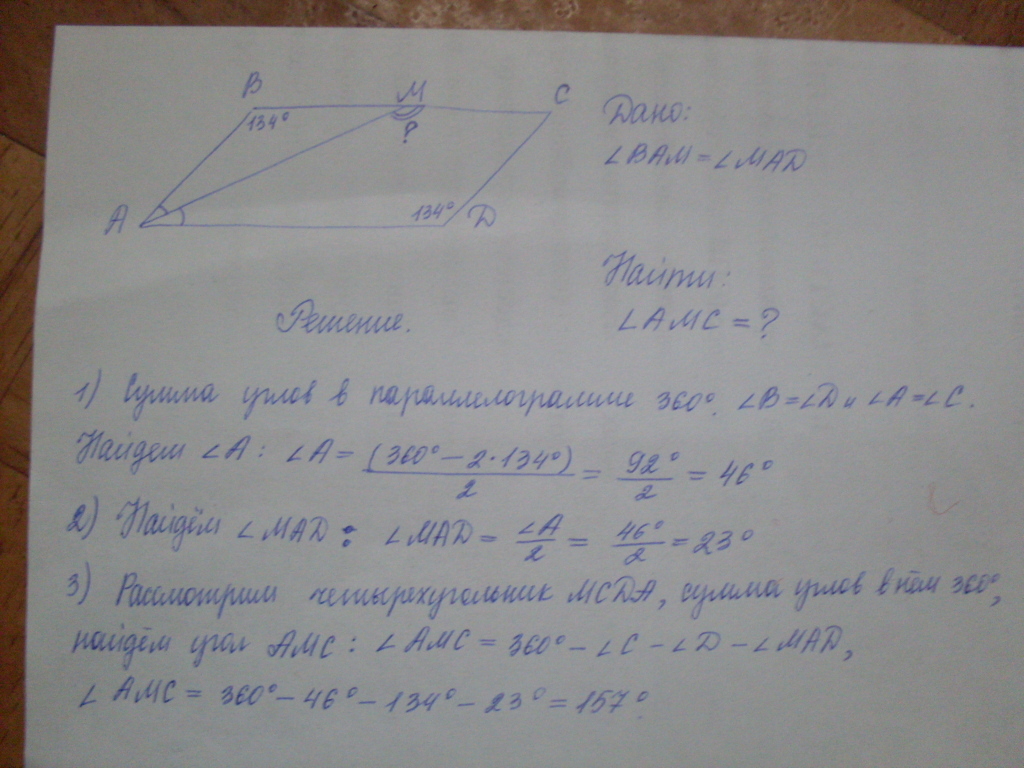 В параллелограме ABCD биссектриса угла A пересекает сторону BC в точке M. Найдите градусную меру угла CMA, если угол CDA = 134 градуса.