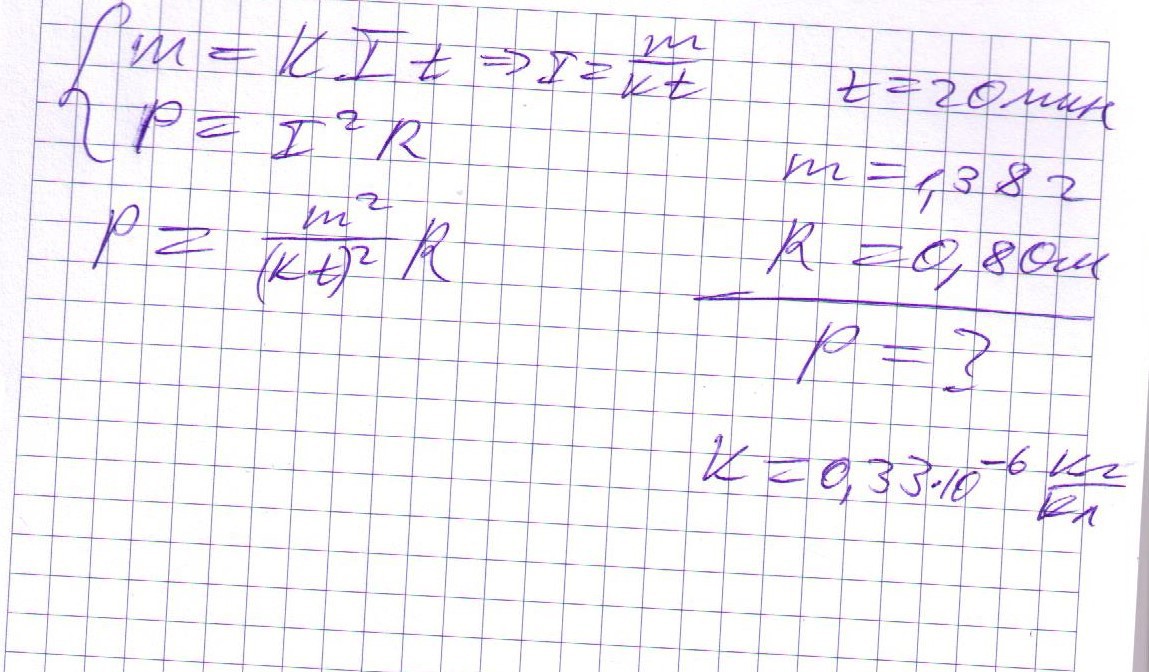 4. В гальванической ванне за 20 мин. выделилось m=1,38г меди. Определить мощность, которая идёт на нагревание жидкости. Сопротивление ванны R=0,8 Ом.