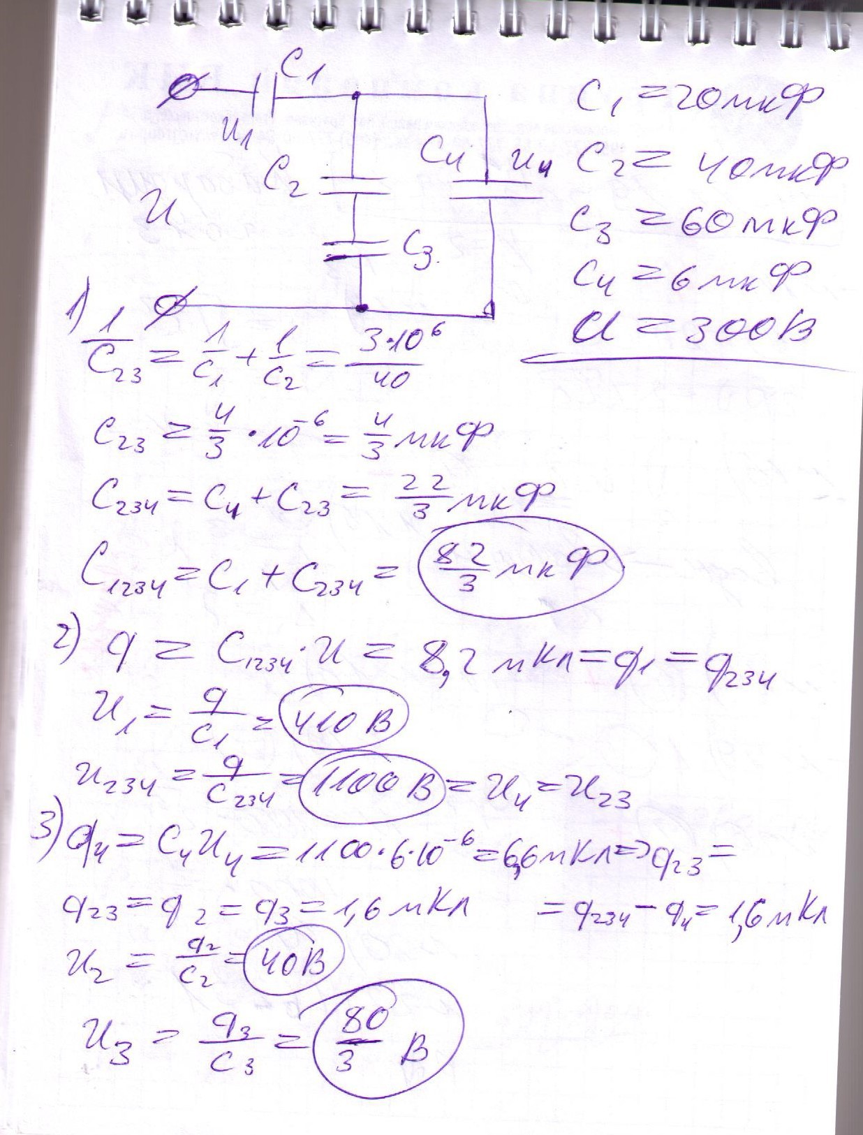 Если С1= 20 мкФ, С2=40 мкФ, С3 =60 мкФ, С4 = 6 мкФ, U=300 В.