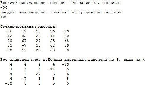 Дана матрица А ( 5,5 ) все элементы ниже побочные диагонали заменить на 5,выше -заменить на 4????