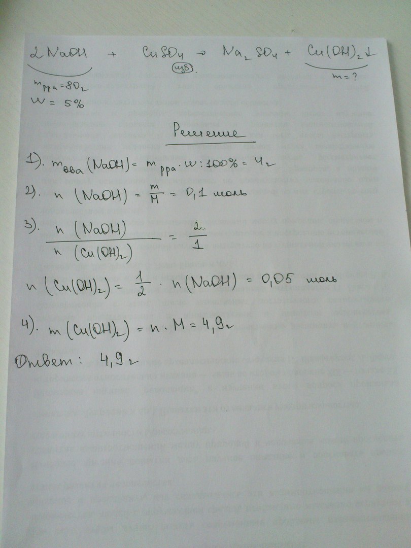 К 80 Г раствора с массовой долей гидроксида натрия 5% добавили избыток раствора сульфата меди(2). Определите массу выпавшего осадка. Помогите пожалуйста, срочно нужно❤️