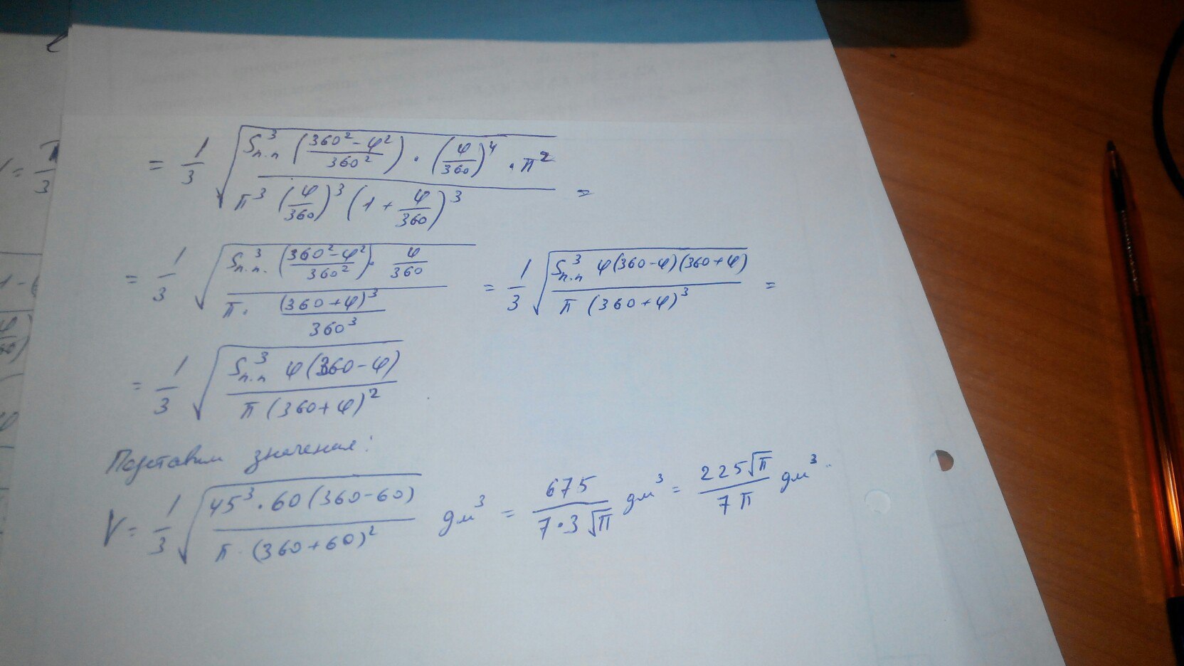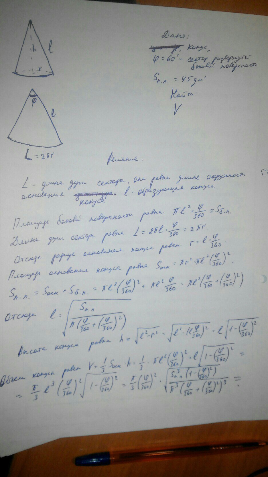 площадь полной поверхности конуса равна 45 дм². Развернутая на плоскость боковая поверхность конуса представляет собой сектор с углом в 60°. Найдите объем конуса.
