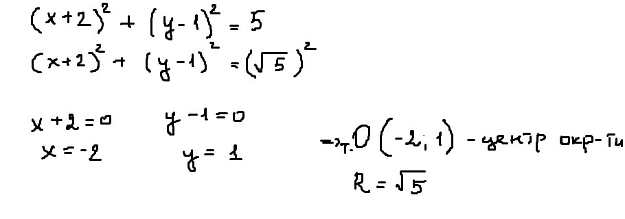 Помогите пожалуйста с детальным решением : Определить координаты центра и радиус окружности: (х+2)^2+(у-1)^2=5 .Заранее очень благодарна за помощь.