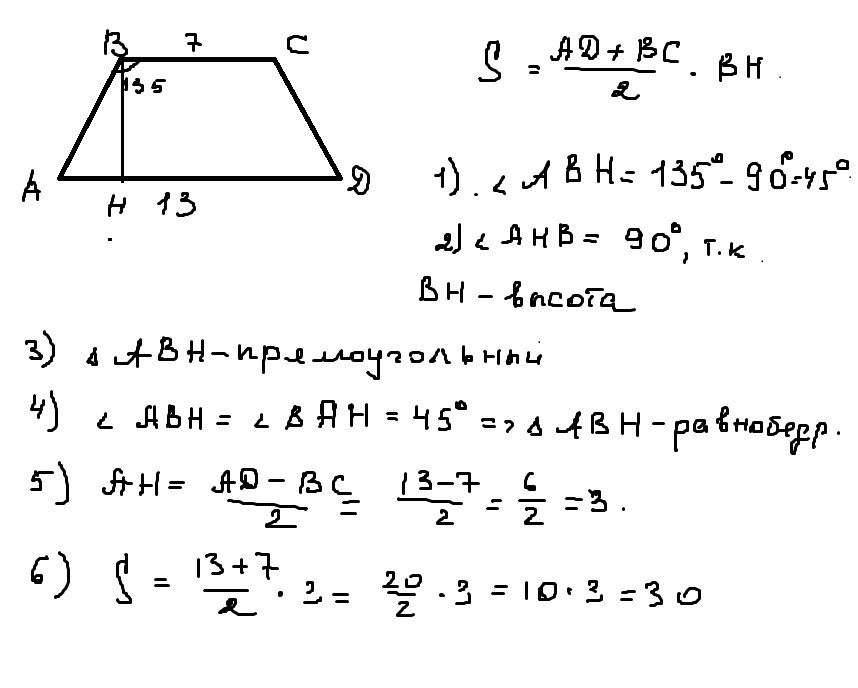 Вычислите пожалуйста площадь равнобедренной трапеции, если ее основания 7 и 13 ,а тупой угол трапеции равен 135°