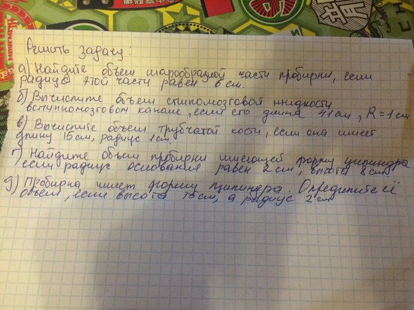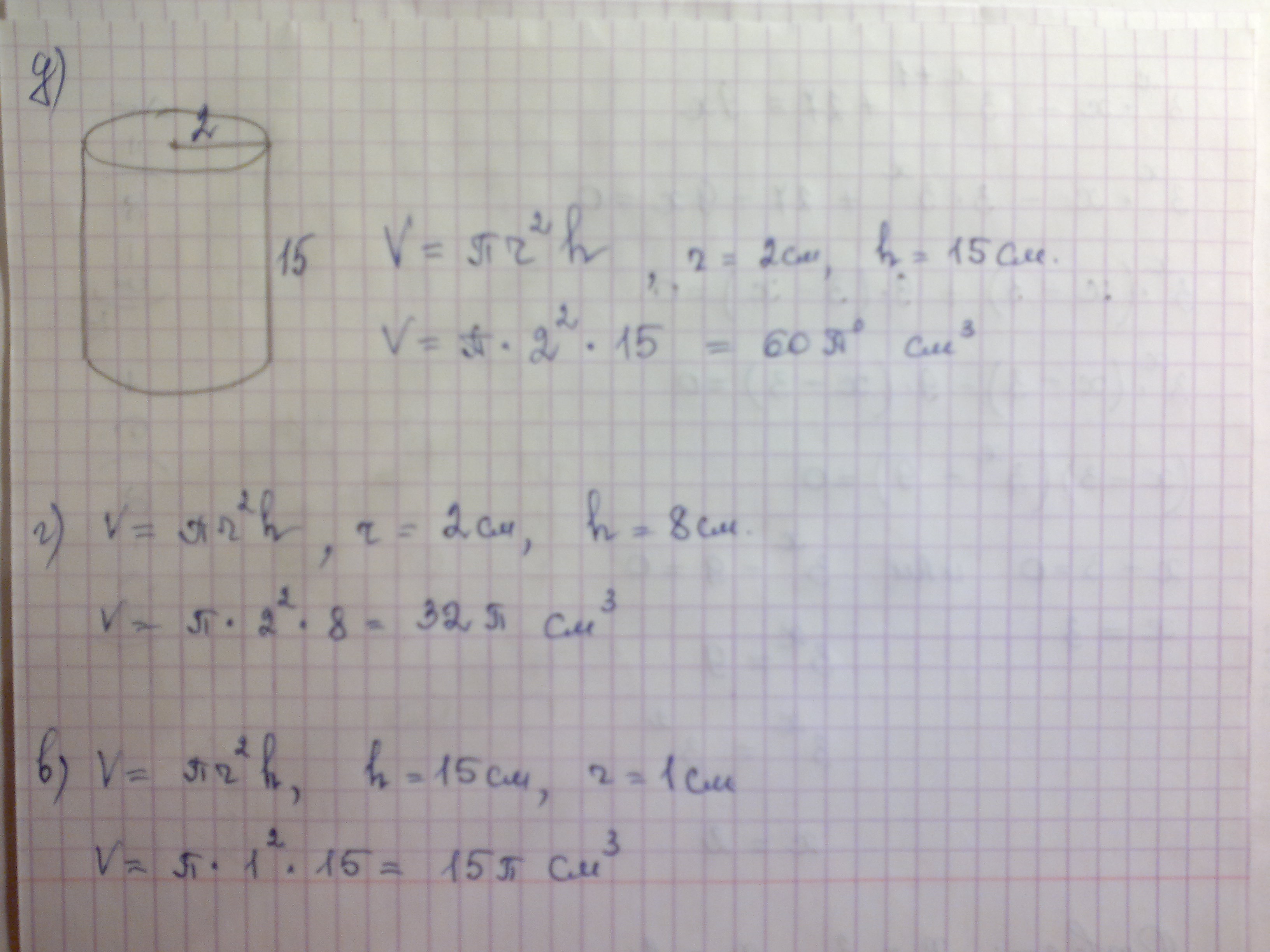 г) Радиус основания пробирки равен r = 2 см, высота равна h = 8 см. Объем пробирки равен V = πr²h = π * 2² * 8 см³ = 32π см³