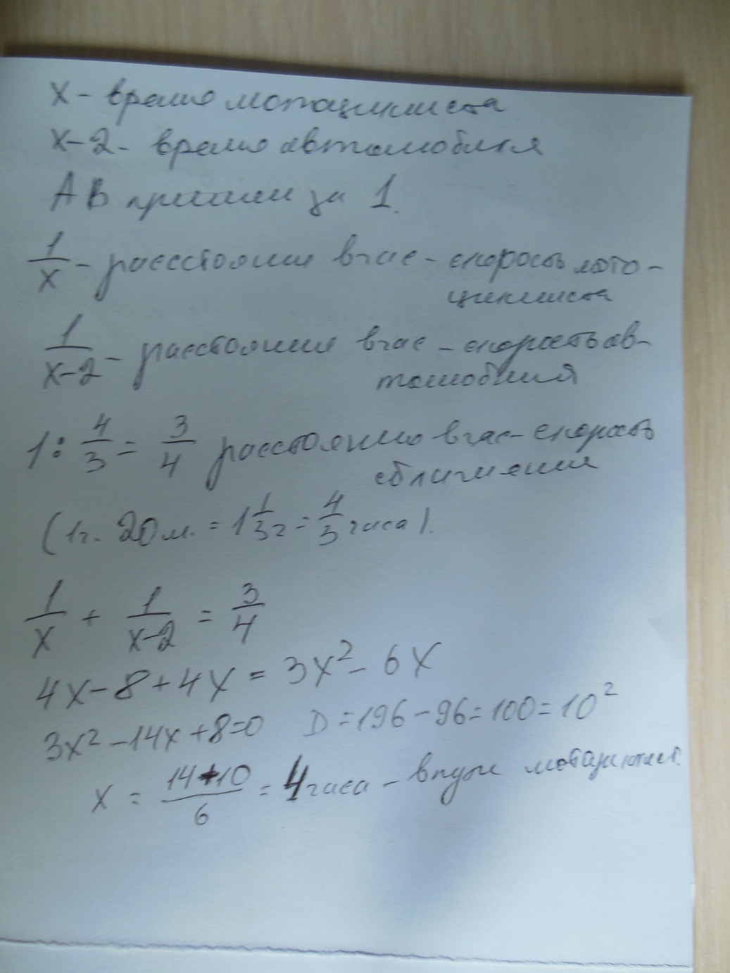 Из пункта А в пункт В выехал мотоцикл. Через 2 часа из А в В выехал автомобиль, который прибыл в В одновременно с мотоциклом. Если бы автомобиль и мотоцикл одновременно выехали из А и В навстречу друг другу, то они встретились бы через 1 час 20 минут после выезда. Сколько времени был в пути из А в В мотоцикл, если скорость мотоцикла и автомобиля постоянные?