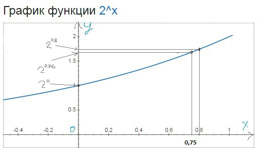 на графике функции y=2^x точка с абсциссой 0,8 расположена выше точки с ординатой 0,75 а та в свою очередь выше чем точка с ординатой 0