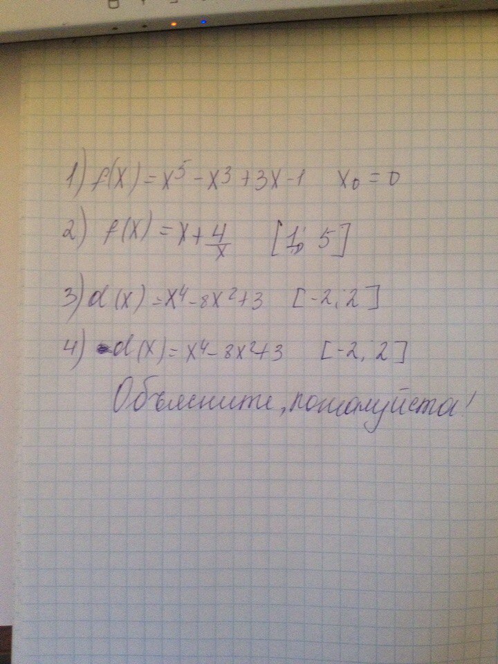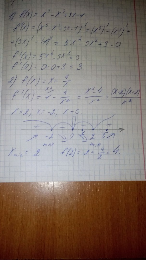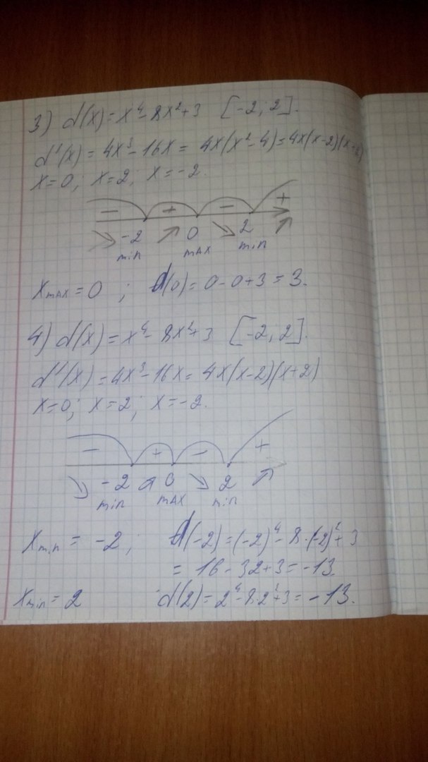 2-4) чтобы найти наибольшее или наименьшее значение функции, нужно найти производную этой функции и приравнять ее к нулю, затем полученные корни отложить на прямой (это как решать неравенства методом интервалов) проставить знаки + или -. Там где минус ф-ция убывает, где + возрастает