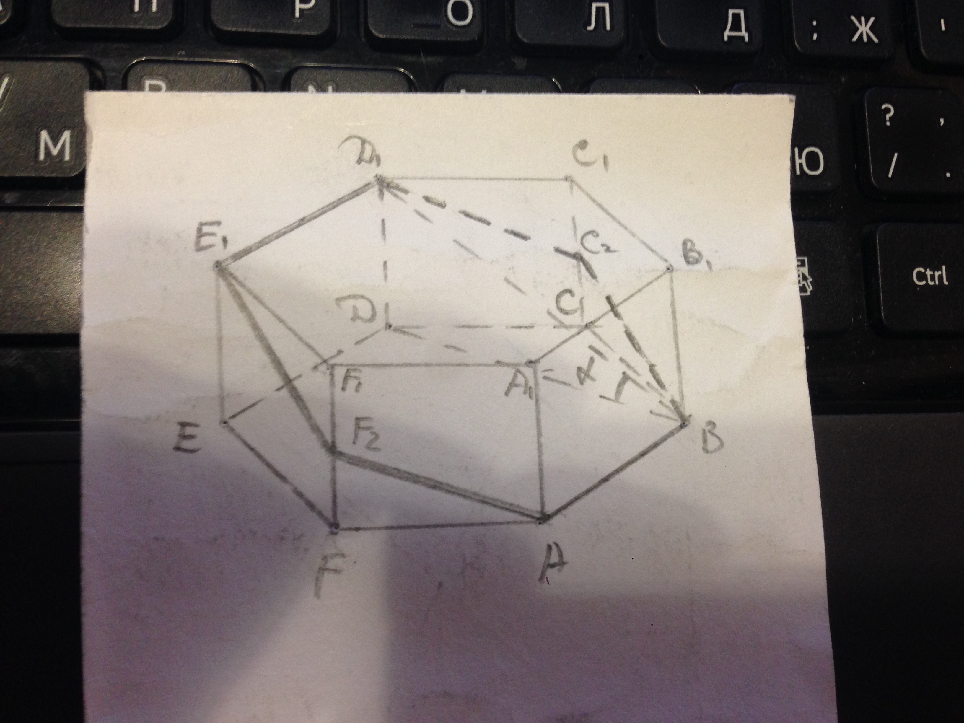 Отношение площади основания к площади сечения равно косинусу угла между ними. S(ABCDEF)/S(ABC₂D₁E₁F₂)=cosα.