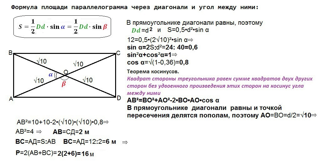 Определите периметр прямоугольника, если его диагональ равна 2√10 м, а площадь 12 м²