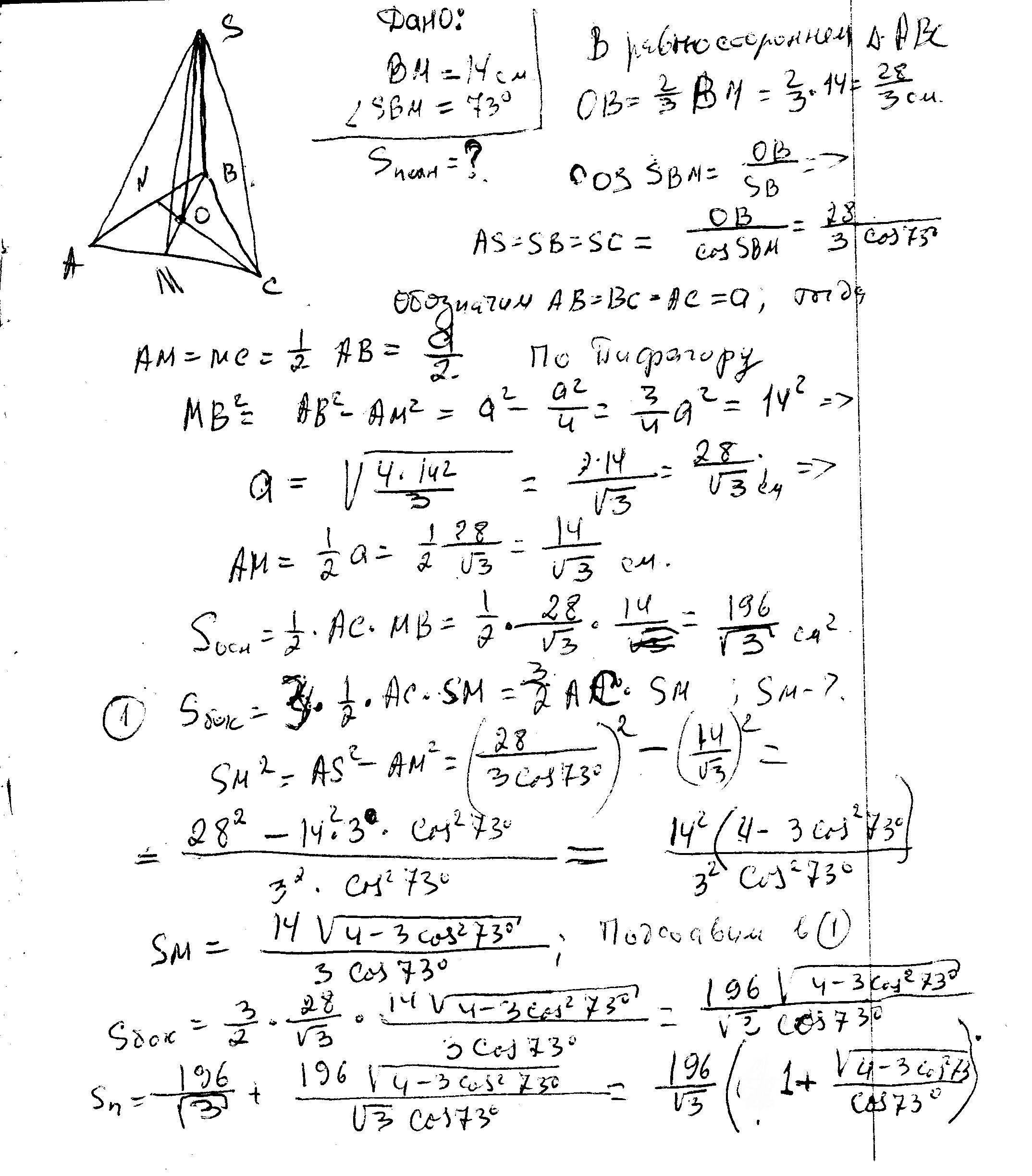 В правильной треугольной пирамиде высота основания 14 см, боковые ребра образует с основанием, угол 73 градуса. Найти Sп.п.