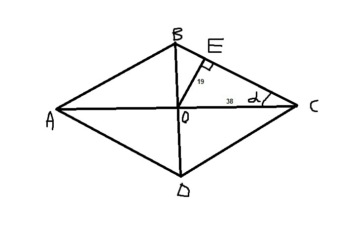 pасстояние от точки пересечения диагоналей ромба до одной из его сторон равно 19, а одна из диагоналей ромба равна 76. Найдите углы ромба.