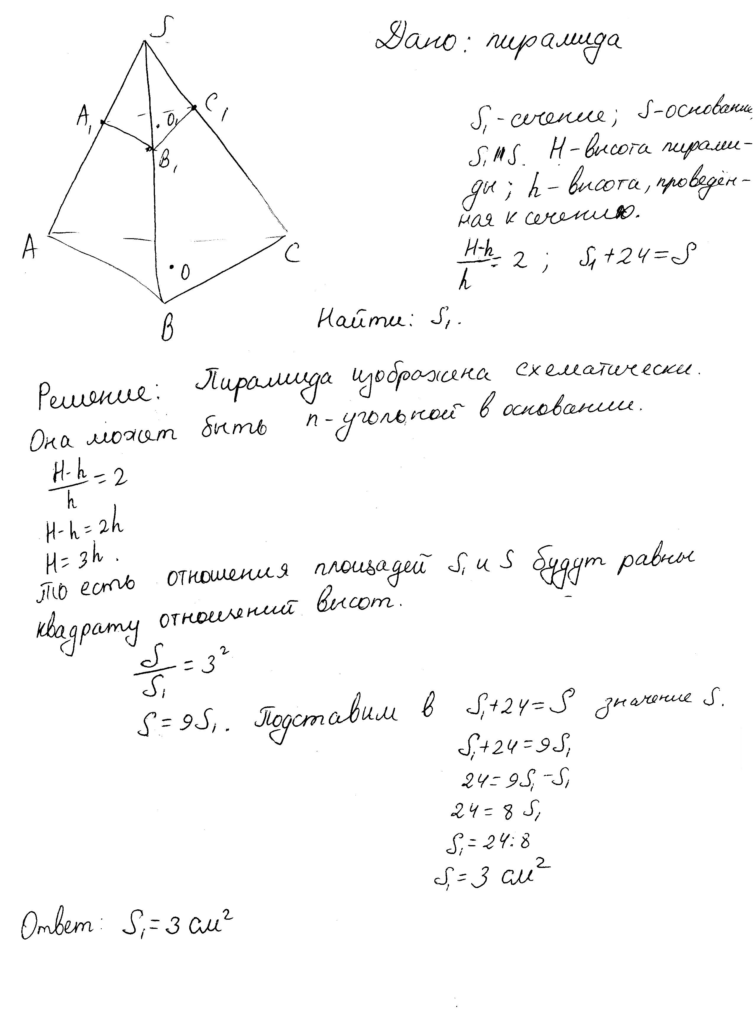 Плоскость параллельная основанию пирамиды,делит ее высоту отношении 1:2.Вычислить площадь сечения если она меньше площади основания на 24 см^2