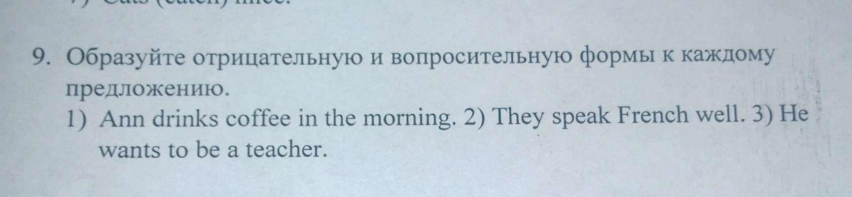 1 Ann doesn't, drink coffee in the morning.2 Does Ann drink coffee in the morning .3 they don't speak French well . 4 Do they speak French well. 5. He doesn't want to be a teacher 6 does he want to be a techer