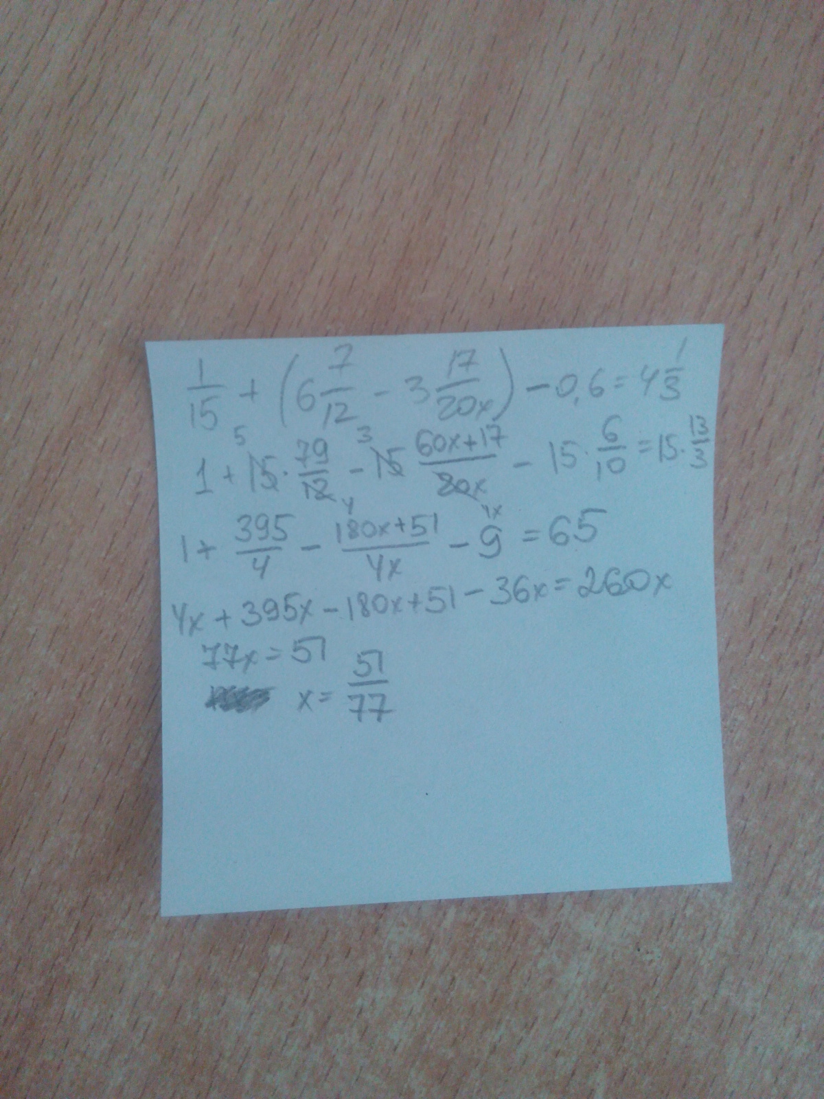 1 /15+( 6 7/12 - 3 17/20х) - 0,6 = 4 1/3