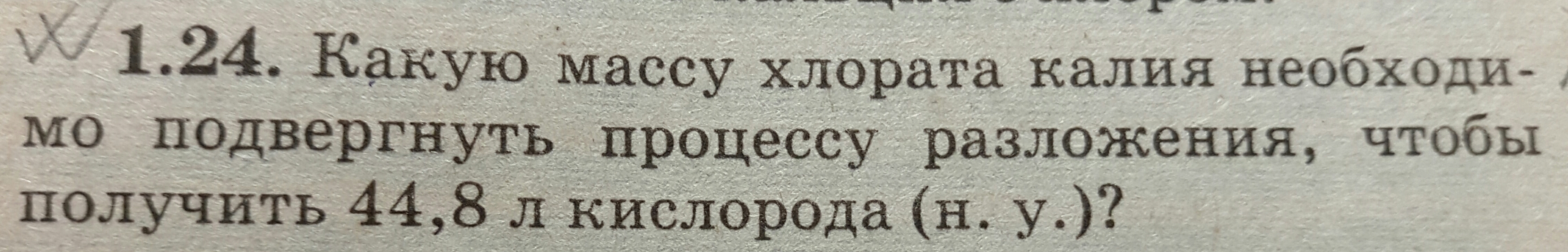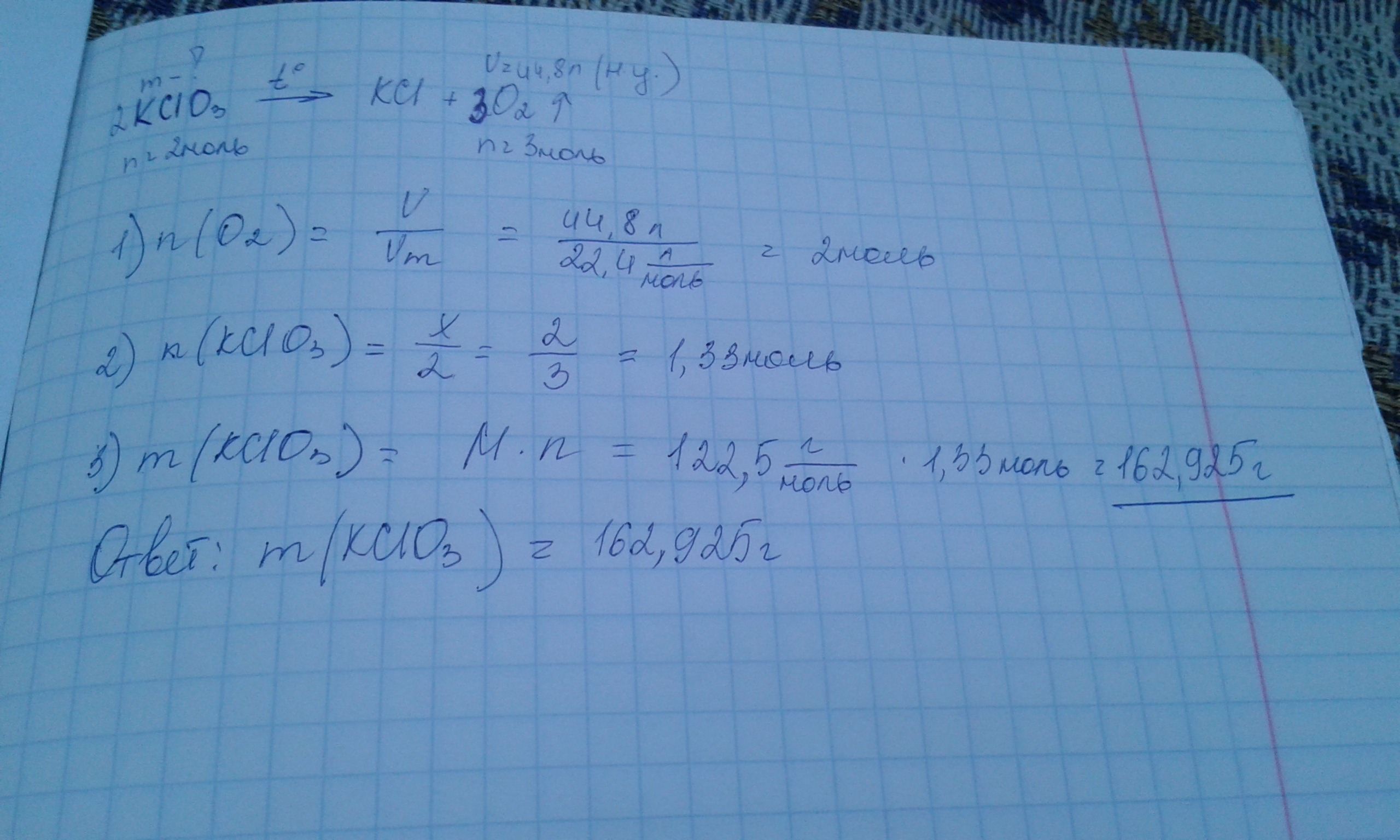Какую массу хлората калия необходимо подвергнуть процессу разложения чтобы получить 44,8л кислорода (н.у.)