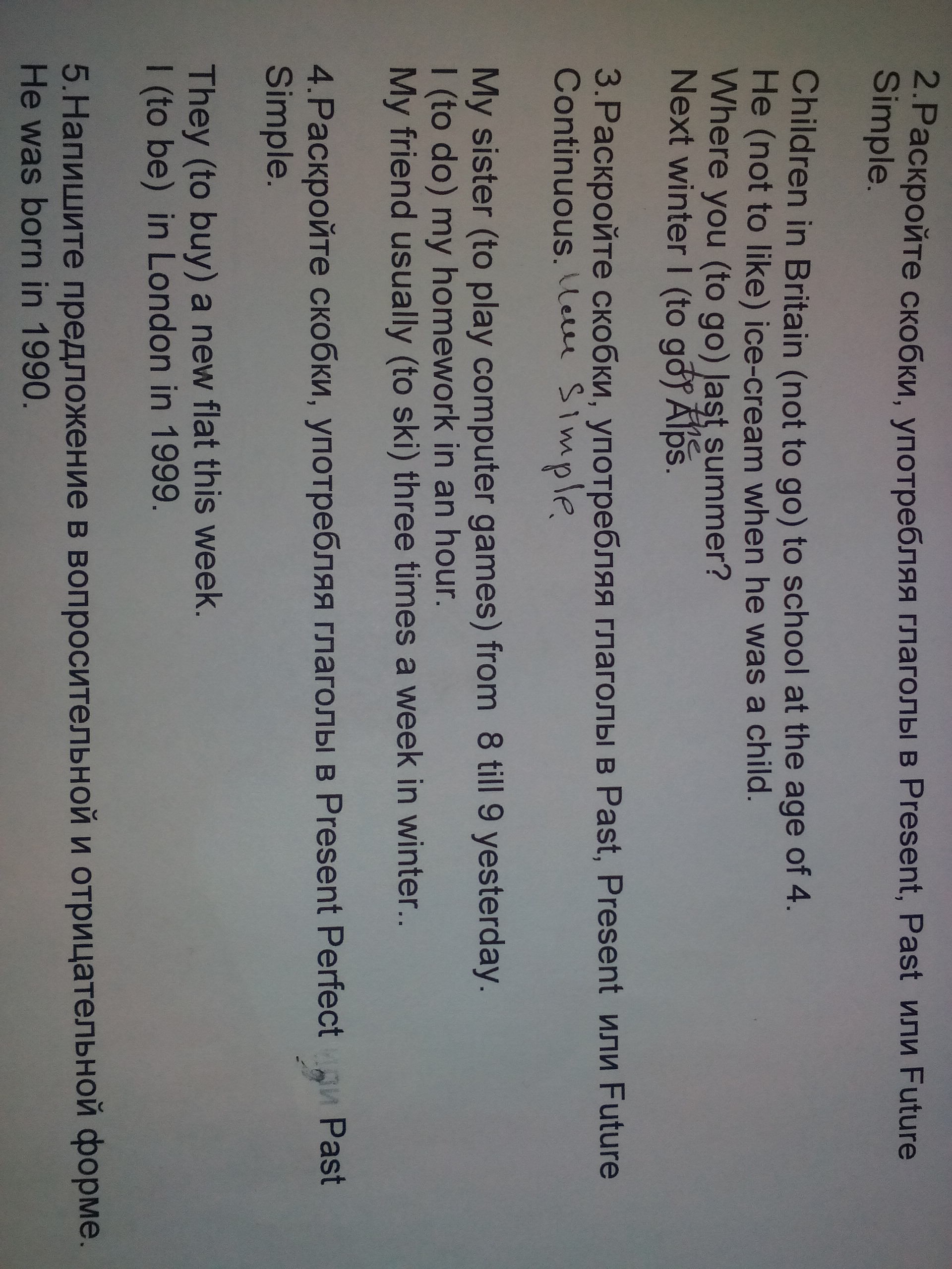 Hello.How are you?Exercise 3 My sister was playing computer games from 8 till 9 yesterday.I will do my homework in an hour.My friend usually skies three times a week.Exercise 4.They have bought a new flat this week.I was in London in 1999