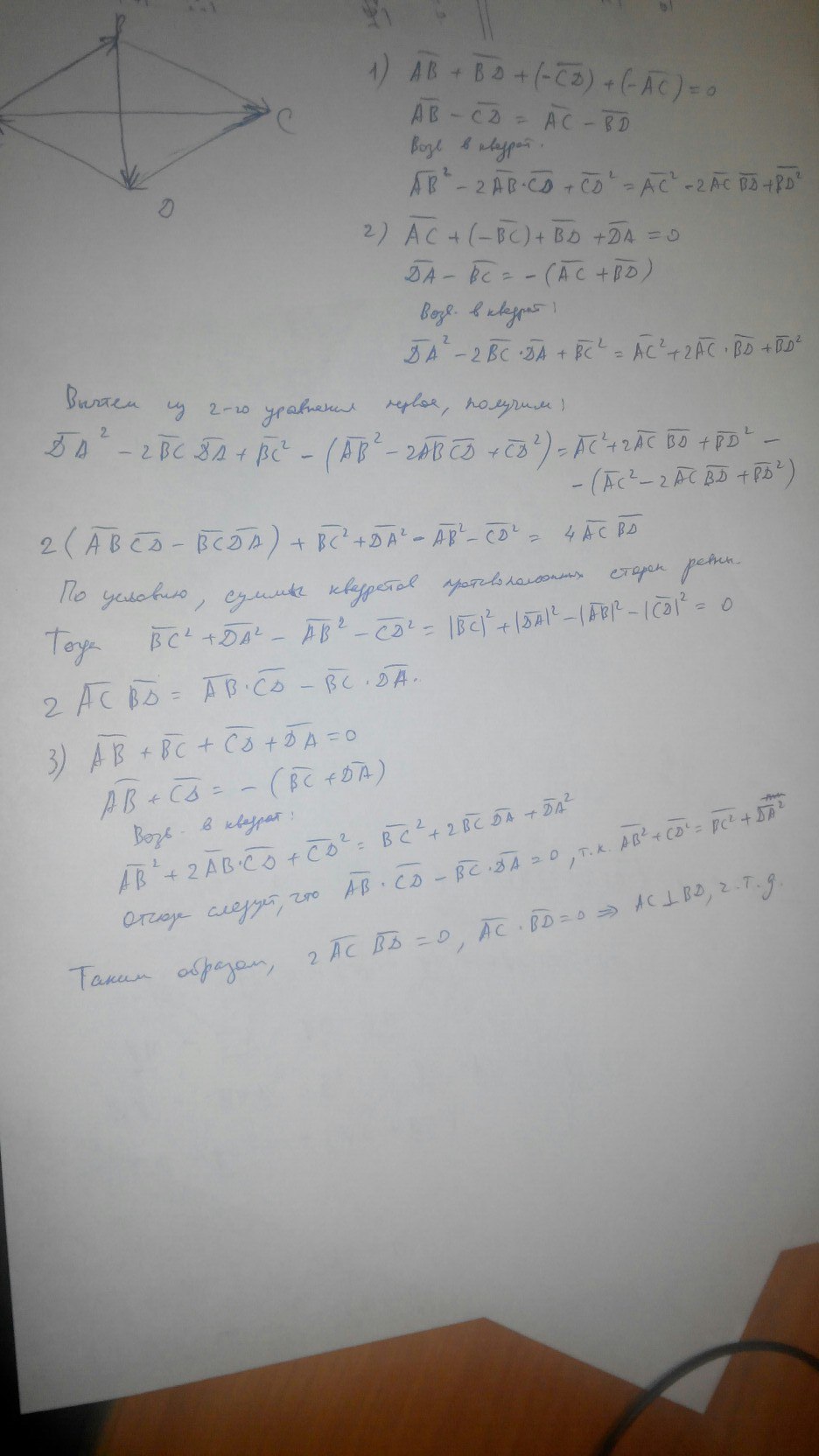 В четырехугольнике АВСD суммы квадратов длин противоположных сторон равны. Методом векторов доказать, что его диагонали АС и ВD взаимно перпендикулярны.