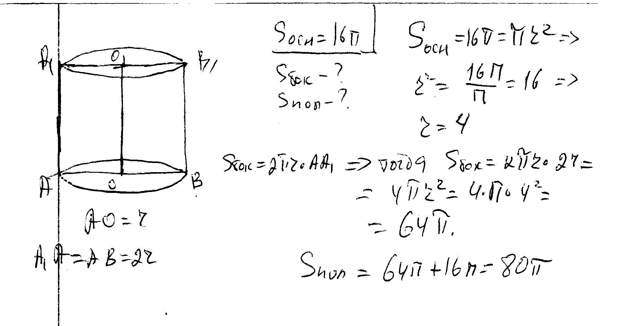 площадь основания кругового цилиндра 16п см^2. Найти боковую и полную поверхность цилиндра,если осевое сечение его квадрат.(если можно то с фото) решение обязательно. Спасибо заранее!