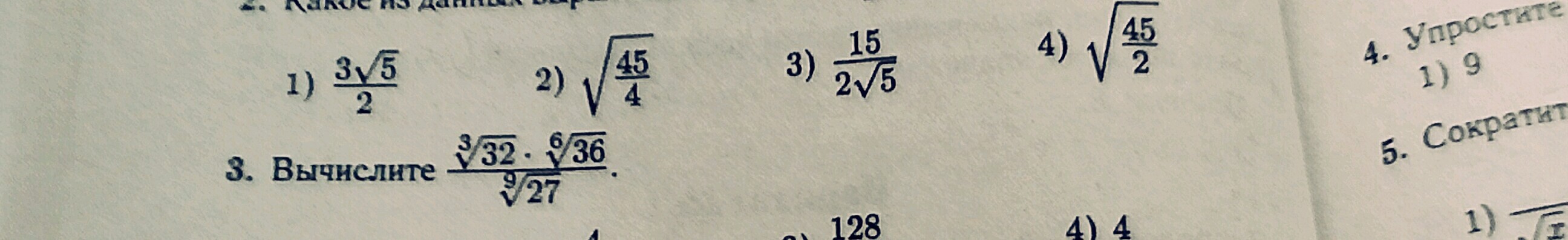 4. Подводите под одну дробь. Получаем корень из 3 (32* (корень из 2 36) / (корень из 3 27). Получаем корень из 3 ((32*6) / 3)). Далее получаем корень из 3 64. Равно 4