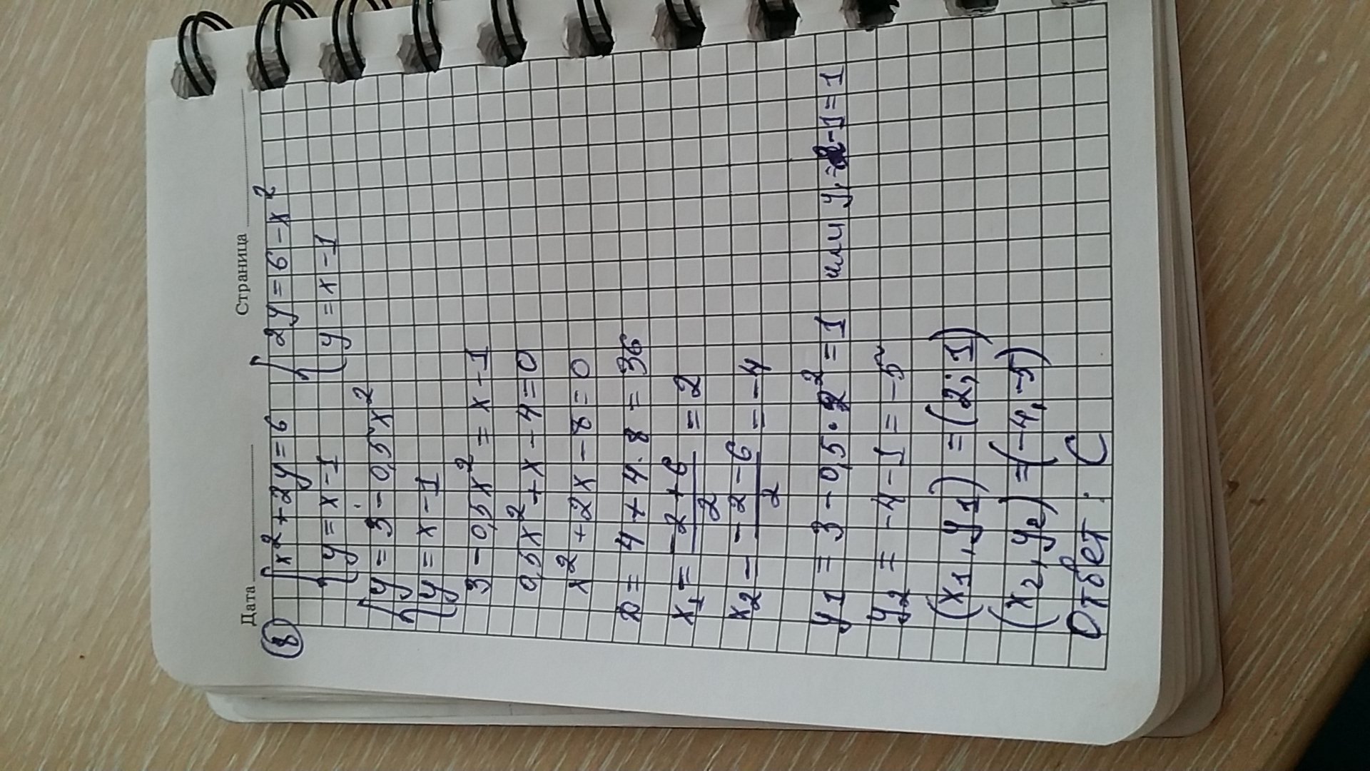Задача 10: ответ (1/2; -5/2). 4х2+х-3=3х-4. Получаем 4х2-2х+1=0. (2х-1) в квадрате=0. 2х=1. Х=1/2. Ну и подставляйте значение Х в любое уравнение и получите значение У (-5/2)