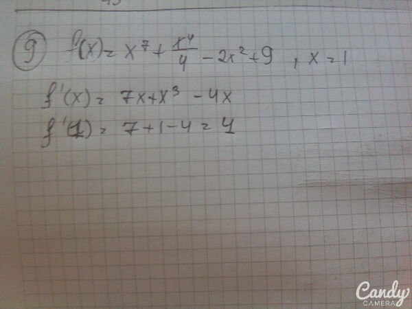 №9. производная равна = 7х⁶+х³-4х+0, если х = 1, то