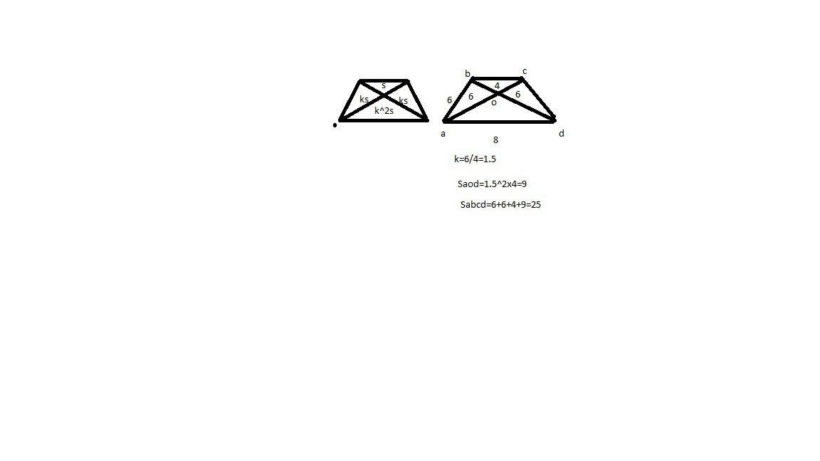 диагонали трапеции abcd (ad||bc) пересекаются в точке o найдите площадьбиссектриса угла в параллелограмма abcd пересекает сторону bc в точке o во сколько раз отрезок co больше отрезка bo если ab=6 ad=8 трапеции если saob=6 , sboc=4