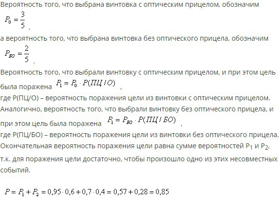 В пирамиде установлены 5 винтовок, из которых 3 снабжены оптическим прицелом. Вероятность того, что стрелок поразит мишень при первом выстреле из винтовки с прицелом равна 0,95, для винтовки без оптического прицела эта вероятность равна 0,7. Найти вероятность того, что мишень будет поражена, если стрелок произведет один выстрел из наудачу взятой винтовки