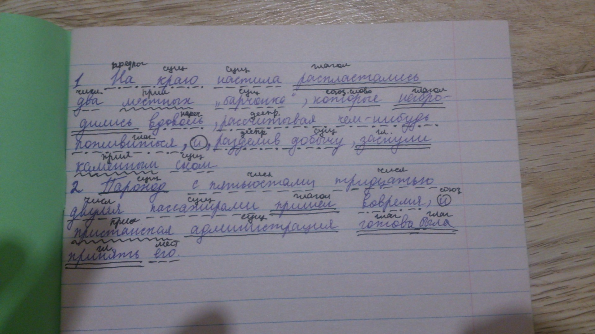 1)На краю настила распластались два местных «барчонка», которые набродились вдоволь, рассчитывая чем-нибудь поживиться, и, разделив добычу, заснули каменным сном. 2) Пароход с пятьюстами тридцатью двумя пассажирами пришел вовремя, и пристанская администрация готова была принять его.